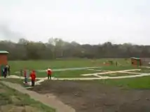 - Стрелковая площадка представляет собой сегмент круга радиусом 19,2 м, ограниченный хордой, проведенной в 5,49 м от центра круга. Длина хорды — 36,8 м. В центре круга делается специальное гнездо для установки контрольного шеста. По концам хорды (на её продолжении) в 0,91 м от точки пересечения хорды с дугой сегмента устанавливают будки для размещения в них метательных машинок.