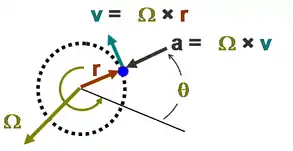 Взаимосвязи векторов показаны на рис. 1. Ось вращения изображена вектором Ω, перпендикулярно плоскости орбиты и имеет величину ω = dθ / dt. Направление вектора Ω выбрано в соответствии с правилом правой руки. По этому соглашению скорость это векторное произведение вида: