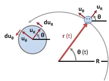 Производная по времени от находится таким же путём, как и для . Опять же, есть единичный вектор, и его конец расположен на единичной окружности, а угол равен π/2 + θ. Следовательно, приращение угла dθ вектора перемещает по дуге на величину dθ, и поскольку перпендикулярен к , мы имеем: