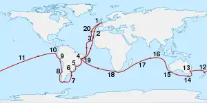 | 1 — Девонпорт, 2 — Тенерифе, 3 — острова Зелёного Мыса, 4 — Баия, 5 — Рио-де-Жанейро, 6 — Монтевидео, 7 — Фолклендские острова, 8 — Вальпараисо, 9 — Лима, 10 — Галапагосские острова, 11 — Таити, 12 — Новая Зеландия, 13 — Сидней, 14 — Хобарт, 15 — залив Короля Георга, 16 — Кокосовые острова, 17 — Маврикий, 18 — Кейптаун, 19 — Баия, 20 — Азорские острова | |