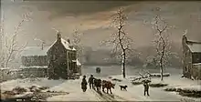 Зимний ландшафт с людьми и коровами