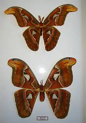 Павлиноглазка атлас (Attacus atlas) — крупнейшие экземпляры самок этого вида могут достигать размаха крыльев до 240 мм. Имеется экземпляр самки, ныне хранящийся в музее Виктории (Австралия), который был добыт в 1922 году на острове Ява. Благодаря неправильной расправке размах его крыльев искусственно увеличился до 262 мм, но при «реконструкции» не превышает 240 мм[25].