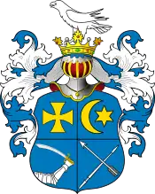 Щит четверочастный, голубой: в 1 поле золотой кавалерский крест; во 2 — золотые: повёрнутый полумесяц и звезда в ряд; в 3 — выходящая влево вооружённая мечом рука; в 4 — серебряные копьё и стрела в андреевский крест.