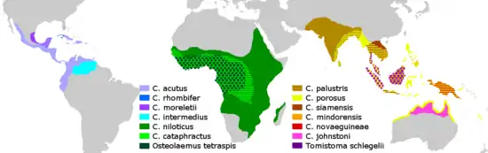 ![]() По часовой стрелке, начало слева-сверху: Longosuchus meani (этозавры), Gavialis gangeticus (крокодилы), Saurosuchus galilei (Rauisuchia), Pedeticosaurus leviseuri (крокодиломорфы), Chenanisuchus lateroculi (эузухии) и Dakosaurus maximus (талаттозухии). | ||||||