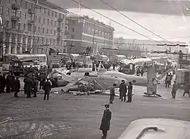 ![]() Вертолёт Ка-27 майора Ольховика лежит на площади Восстания. Отчётливо видно повреждённый трамвай и работу аварийных служб. | |