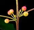 Слева направо: побег с листьями и незрелыми плодами; лист (адаксиальная и абаксиальная стороны); соцветие; цветки: незрелые и зрелые плоды; семена | ||||||||||