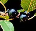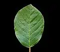 Листья эллиптической формы, 4—10 см в длину, цельнокрайние, с шестью — восемью парами параллельных боковых жилок, расположены на коротких (до 1,5 см) черешках. Расположение листьев — очерёдное или косо-супротивное.