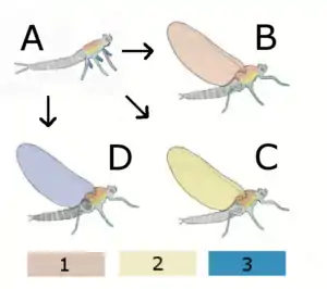 Иногда крылья появляются лишь на отдельной стадии жизненного цикла, например, на стадии расселения у тлей. Кроме присутствия или отсутствия крыльев, разные морфы могут также отличаться по структуре и окраской крыльев, как, например, тли, мигрирующие стадии саранчи и полиморфные бабочки.