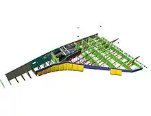 Лонжеронное крыло включает один или несколько продольных силовых элементов — лонжеронов, которые воспринимают изгибающий момент.[15] Помимо лонжеронов, в таком крыле могут присутствовать продольные стенки. Они отличаются от лонжеронов тем, что панели обшивки с стрингерным набором крепятся к лонжеронам. Лонжероны передают нагрузку на шпангоуты фюзеляжа самолёта с помощью моментных узлов.[16]