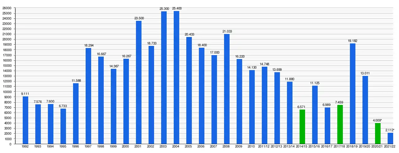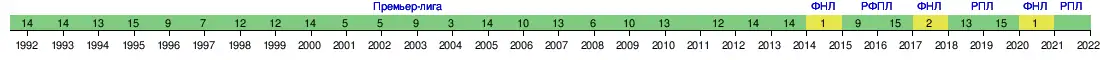 График выступления ФК «Крылья Советов» в чемпионатах СССР (красная линия) и России (синяя линия)
