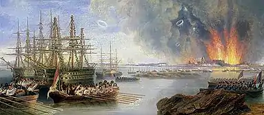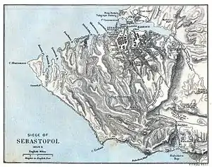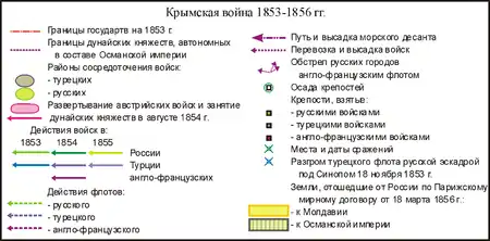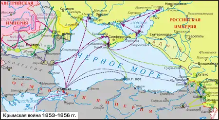 Кры́мская война́ 1853—1856 годо́в (тур. Kırım Savaşı), или Восто́чная война́ (фр. la Guerre d’Orient), или Русская война́ (англ. Russian war)[11] — война между Российской империей, с одной стороны, и коалицией в составе Британской, Французской, Османской империй и Сардинского королевства, с другой. В самой России до начала XX века использовалось «французское» название «Восточная война», а также «Турецкая война», пока не было принято общеупотребительное обозначение «Крымская война»[12]. Боевые действия разворачивались на Кавказе, в Дунайских княжествах, на Балтийском, Чёрном, Азовском, Белом и Баренцевом морях, а также в низовьях Амура, на Камчатке и Курилах[13]. Наибольшего напряжения они достигли в Крыму, поэтому в России война получила название «Крымской».