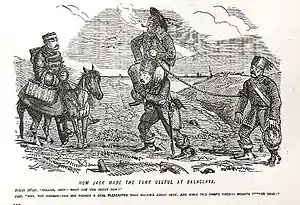 Зависимое положение, в котором оказалась Османская империя по отношению к Великобритании в тот период, иллюстрирует карикатура в лондонском журнале «Панч» (1856 г.)[26]. На рисунке изображён английский солдат, оседлавший одного турка и держащий на привязи другого.