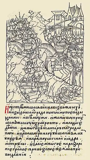![]() И устремишася вси на безбожных, и изыдоша из града не токмо воеводы и все мужи, и жены, восприемше мужескую храбрость, и младые дети, и многих татар под градом поби, и царева шурина убиша, князя Камбирдея, и наряд пушечной и ядра, и стрелы, и зелие многое, на разорение града привезенное, взяша православнии. Миниатюра Лицевого летописного свода. | |||