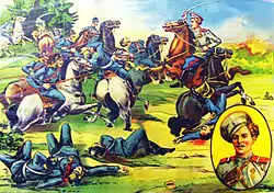 Казак Крючков. Разведочный отряд из четырёх казаков, в котором находился Кузьма Крючков, благополучно перешёл границу. Неприятеля нигде не было видно. Мало-помалу отряд углубился в Пруссию. В небольшой роще казаки заночевали. Утром в нескольких верстах от них показался разъезд прусской кавалерии в 27 человек. Когда пруссаки приблизились на расстояние ружейного выстрела, казаки спешились и открыли огонь. Офицер, начальник немецкого отряда, что-то скомандовал. Прусские кавалеристы стали быстро удаляться. Казаки вскочили на коней и с гиканьем помчались на неприятеля. Кузьма Крючков на своей резвой лошади обогнал товарищей и первый врезался в неприятельский отряд. Подоспевшие остальные казаки на мгновение увидели Крючкова, окружённого пруссаками и размахивающего своей шашкой направо и налево. Затем люди и лошади, — всё смешалось в общей свалке. Один из казаков увидел, как в этой свалке к Крючкову протискивается прусский офицер с обнажённой шашкой. Казак выстрелил. Прусский офицер упал. Крючков тем временем тоже выхватил винтовку и хотел выстрелить в прусского унтер-офицера, но тот ударил Крючкова саблей по руке, рассёк ему пальцы, и казак выронил винтовку. В следующий момент, несмотря на полученную рану, Крючков рассёк унтер-офицеру шею. Два пруссака с пиками набросились на Крючкова, пытаясь выбить его из седла, но Крючков ухватился руками за неприятельские пики, рванул их к себе и сбросил обоих немцев с коней. Затем, вооружившись прусской пикой, Крючков опять бросился в бой. Прошло несколько минут — и из 27 пруссаков, сражавшихся с 4 донскими казаками, остались на конях только три, которые и обратились в дикое бегство. Остальные были или убиты или ранены. Казаки послали вслед бегущим ещё несколько пуль. Кузьма Крючков один свалил 11 немцев и сам получил 16 ран. Ранен пулей. Шашкой разрублена рука. Остальные поранения пиками. Несмотря на всё это, Крючков до самого конца боя оставался в строю. Командующий армией по телеграфу поздравил наказного атамана войска Донского с награждением первым Георгиевским крестом в армии казака хутора Нижний-Калмыков, Усть-Медведицкого округа, Кузьмы Крючкова, который один убил 11 немцев, получил 16 ран пикой в себя и 11 в лошадь. Крючков родился в старообрядческой семье. Грамоте учился дома. Он не силён, но очень гибок, увёртлив и настойчив. Всегда был первым во всех играх, требовавших ловкости. Отец Крючкова небогат, занимается земледелием. После женитьбы Крючков и его жена были главной опорой всей семьи. Среди хуторян Крючковы пользуются заслуженной репутацией домовитых и религиозных хозяев.[6]