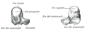 | Сочленения | полулунная, трёхгранная, головчатая, 4-я и 5-я пястные кости |