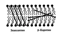 Также зеаксантин выполняет важную структурную роль в мембранах тилакоидов. При повышенном освещении ксантофиллы распределяются между светособирающими комплексами и липидным бислоем. Поскольку зеаксантин имеет две гидрофильные -OH группы, он располагается поперек бислоя, тем самым увеличивая вязкость мембраны. Увеличение вязкости мембраны благодаря зеаксантину и некоторым терпеноидам (α-токоферол) снижает её проницаемость для кислорода и защищает липиды от перекисного окисления его активными формами[6].