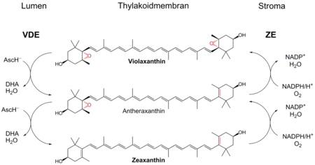 Виолоксантиновый цикл выполняет функцию защиты фотосинтетического аппарата от избытка энергии при повышенной инсоляции. Он позволяет избежать фотоингибирования, значительно увеличив нефотохимическое тушение. Цикл включает в себя ферментативные взаимопревращения между виолоксантином и зеаксантином (промежуточный продукт — антероксантин). Виолоксантиновый цикл протекает в минорных субъединицах светособирающего комплекса фотосистемы II (белки CP29, CP26, CP23, CP22 и др.). При высокой интенсивности света вследствие активной работы ЭТЦ фотосинтеза происходит закисление люмена тилакоидов. При падении pH до 5,0 активируются фермент деэпоксидаза, которая с люменальной стороны мембраны осуществляет восстановление эпоксидных групп виолоксантина, используя в качестве восстановителя аскорбиновую кислоту. Двукратное восстановление приводит к образованию зеаксантина, который и выполняет фотопротекторную функцию. При снижении интенсивности освещения, происходит обратная реакция катализируемая эпоксидазой, расположенной со стромальной стороны мембраны. Для введения эпоксидных групп необходим молекулярный кислород и восстановитель (NADPH). В результате образуется виолоксантин, который может выполнять роль светособирающего пигмента.