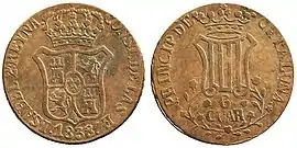 6-куартовая монета Изабеллы II отчеканена в Барселоне в 1838 году