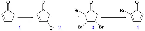 Аллильное бромирование прекурсора N-бромсукцинимидом по Циглеру в тетрахлоруглероде и последующее бромирование образующегося ненасыщенного соединения приводит к образованию 2,3,4-трибромпроизводного циклопентанона. Посредством элиминирования двух эквивалентов бромоводорода из полученного соединения в диэтиловом эфире в присутствии диэтиламина получают бромциклопентадиенон.