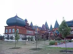 Современный полноразмерный макет дворца царя Алексея Михайловича в Коломенском. На переднем плане — трапезная палата, увенчанная кубоватым покрытием.