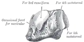 Кубовидная кость располагается у латерального края стопы, кпереди от пяточной кости, имеет неправильно-кубовидную форму.