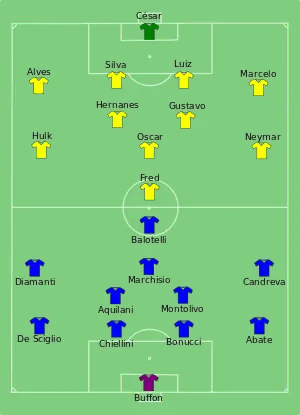 - Tactical Line-up – Group A – Italy-Brazil. ФИФА (22 июня 2013). Дата обращения: 3 декабря 2017. Архивировано 28 июня 2013 года.