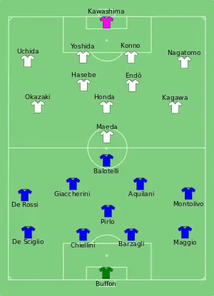 - Tactical Line-up – Group A – Italy-Japan. ФИФА (19 июня 2013). Дата обращения: 3 декабря 2017. Архивировано 20 июня 2013 года.