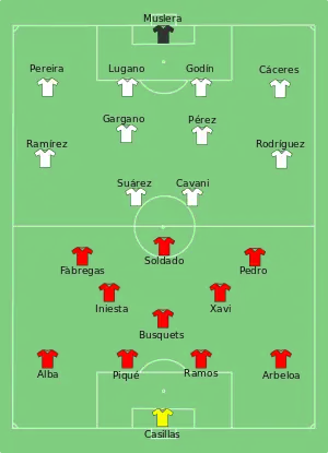 - Tactical Line-up – Group A – Spain-Uruguay (недоступная ссылка). ФИФА (16 июня 2013). Дата обращения: 3 декабря 2017. Архивировано 3 марта 2016 года.
