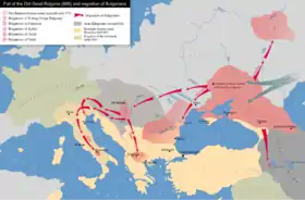 «После смерти К[убрата] [ближе к концу правления визант[ийского] имп[ератора] Константа II (641—668), вероятно, ок. 660—665], — указывает А. В. Комар, — возглавляемое им объединение распалось; часть во главе с сыном К[убрата] Батбаяном была подчинена хазарам, другие мигрировали, в том числе и орда 2-го сына К[убрата] — Аспаруха, основавшего Первое Болгарское царство на Дунае»[3].