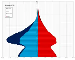 По данным всемирной книги фактов ЦРУ численность населения Кувейта в 2021 году составила 3 032 065 человек. По оценке на 2018 год этнический состав Кувейта: Кувейтцы — 30,4%, арабы других национальностей — 27,4%, азиаты — 40,3%, африканцы — 1%, другие — 0,9% (включая европейцев, североамериканцев, южноамериканцев и австралийцев). Государственное управление гражданской информации Кувейта оценивает общую численность населения страны в 4 420 110 человек на 2019 год, причем иностранцы составляют почти 70% населения страны. Городское население — 100 % (2021 год).[18] Большая часть населения сосредоточена в столице Эль-Кувейте. Суммарный коэффициент рождаемости на 2021 год — 2,25 рождений на женщину.[18] Грамотность — 96,1 %; мужчин — 96,7 %, женщин — 94,9 % (2018 год).[18] Около 24,29 % населения составляет возрастная группа до 15 лет, 72,79 % — от 15 до 65 лет, 2,92 % — старше 65 лет.[18] В 2021 году рождаемость оценивалась в 17,9 на 1000 населения, смертность — 2,23 на 1000, иммиграция — -3,65 на 1000, прирост населения составил 1,2 %. Младенческая смертность — 7,6 на 1000 новорождённых.[18] Ожидаемая продолжительность жизни населения по состоянию на 2021 год — 78,9 лет, у мужчин — 77,44 лет, а у женщин — 80,43 лет.[18] Средний возраст населения по состоянию на 2020 год — 29,7 лет (мужчины — 30,7 лет, женщины — 27,9 лет).[18]