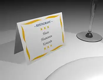 Кувертные карточки располагают на столе рядом с прибором каждого из гостей в соответствии с планом рассадки. Гостю может выдаваться карточка-памятка со схемой расположения столов и указанием на его стол.