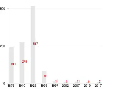 Число жителей по семейным спискам 1879 г.: 115 м п., 126 ж. п.; по приходским сведениям 1879 г.: 102 м п., 122 ж. п.[3]
