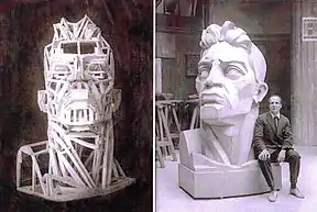 В 1927 г. он создает крупномасштабную скульптуру «Голова рабочего». Это произведение можно отнести к проявившимся ещё в Казани авангардным поискам художника. На анатомически выверенной каркасно-реечной основе, используя выкроенные фанерные листы, он формирует образ, сочетающий в себе монументальность и выразительную пластику. Во время посещения ВХУТЕМАС-а на эту работу обращает внимание А. В. Луначарский, и в газетах появляются статьи о ней. В «Известия ВЦИК» С. Бурдянский писал, что «… вся скульптура … в значительной мере от архитектуры» (4). В первую очередь это относят к каркасу, впечатлявшего конструктивной структурой, органично формирующей пластику цельного объёма. Скульптура была приобретена государством, и автору предложили облицевать её металлическими пластинами. Позже художник использует тот же принцип для сооружения объёмных праздничных композиций и в кинорекламе.
