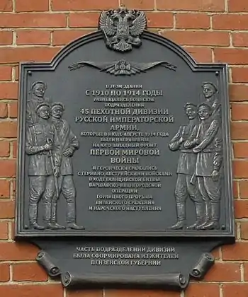 - Мемориальная доска пензенцам — участникам Первой мировой войны (45-й пехотной дивизии Русской императорской армии) на здании Института военного обучения Пензенского государственного университета, г. Пенза (2014)[2][3][4][5][6][7][8][9][10][11][12][13][14][15][16].