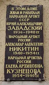 - Мемориальная доска на доме № 44 по Советской улице в Ростове-на-Дону: «В этом доме жили и работали: Народный артист СССР Юрий Александрович Завадский 1936—1940 гг. Народный артист России Александр Алексеевич Никитин 1940—1954 гг. Народная артистка России Елена Архиповна Кузнецова 1954—1990 гг.»[1]. Установлена в 2013 году.