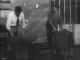 В фильме показана работа пары кузнецов — один бьёт молотом по заготовке, а другой вращает ручку ручного насоса. В самом конце фильма появляется третий человек и наливает одному из кузнецов попить.