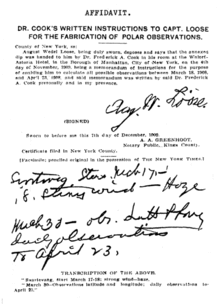 В создавшейся ситуации Кук попытался фальсифицировать расчёты, поручив астрономические вычисления двум газетчикам — Данклу и Лузу, представившимся моряками. Полученная от Кука расписка за гонорар (250 долларов) стала очередным «гвоздём в гроб первопроходца», так как была тут же опубликована, это произошло 9 декабря 1909 года[44][110]. Кук не смог удовлетворительно объяснить этот эпизод и в своей книге 1911 года, которая вообще была написана очень эмоционально[109]. В конце 1909 года комиссия Копенгагенского университета, изучив материалы Кука, заявила, что не представлено никаких наблюдений, которые бы свидетельствовали о достижении Северного полюса[111][Прим 4]. Имя Кука не было включено в списки награждённых Золотой медалью Королевского датского географического общества, хотя медаль вручили ему ещё в сентябре[112]. Кук в тот период организовал длительное лекционное турне по странам Европы и Южной Америки и вернулся в Нью-Йорк в декабре 1910 года[113].