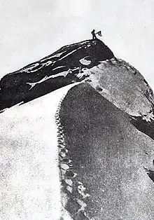 8 сентября 1906 года Кук и Баррил отправились по леднику Рут, открытому Куком за три года до этого. До 10 сентября они преодолели 30 км через проход Грейт Годж, расположенный на высоте 2500 м[53]. Дальнейшая интерпретация сообщений Кука чрезвычайно затруднительна из-за отсутствия карт местности (они будут созданы спустя полвека), поэтому опорных ориентиров маршрута, признаваемых всеми исследователями, не существует[52]. Тем не менее известно, что Кук направился обходным путём к северному подножью горы. По его заявлению, вершины горы он достиг в 10:00 по местному времени 16 сентября, но из-за сильного мороза пробыл там всего 20 минут. Телеграмма об этом достижении была доставлена Г. Бриджмену 27 сентября[54]. В 1908 году вышла книга о восхождении «На крыше континента» (англ. At the Top of the Continent), Кука к тому времени уже год не было в США.