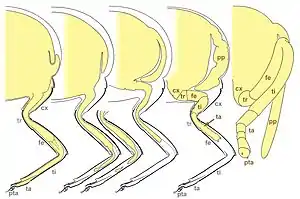 При превращении личиночной ноги в куколочную у некоторых насекомых каждый членик куколочной ноги (тазик, вертлуг, бедро, голень, лапка, претарсус) развивается из соответствующего членика личиночной ноги, то есть сохраняется онтогенетическая гомология члеников ноги; у некоторых насекомых онтогенетическая гомология члеников нарушена, например куколочная лапка может развиваться из личиночного бедра (см. рисунок Chrysoperla carnea) и т. п.; во всех случаях каждая нога куколки всегда развивается только из соответствующей ноги личинки, то есть всегда соблюдается онтогенетическая гомология конечностей.