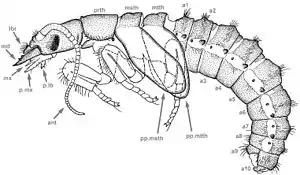 При превращении личинки в куколку и далее в имаго личиночные глаза, каждый из которых обычно состоит из 7 или меньшего числа омматидиев, полностью заменяются на фасеточные имагинальные глаза (так что между личиночными и имагинальными глазами нет онтогенетической гомологии).