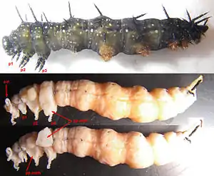 Лишь у чешуекрылых гиподерма ноги не уменьшается, а сразу начинает расти, в результате чего ткани куколочной ноги целиком заполняют личиночную ногу (см. фото Vanessa io).
