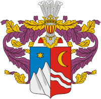 Щит увенчан дворянскими шлемом и короной со страусовыми перьями. Намёт на щите пурпуровый, подложенный золотом[2].