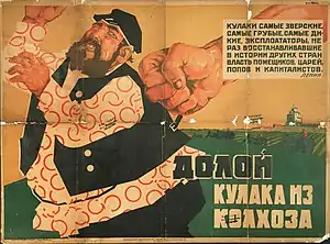 - кулаки — зажиточные крестьяне, использующие наёмный труд, сельская буржуазия, спекулянты. Советские исследователи относят к признакам кулачества «эксплуатацию наёмного труда, содержание торгово-промышленных заведений, ростовщичество[12]». В то же время есть утверждение, что «ясного понимания того, что скрывается за этим популярным выражением „кулачество“, нет совершенно»[13];
