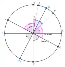 где — широта повышенного полюса: для наблюдателя в северном полушарии, в южном.