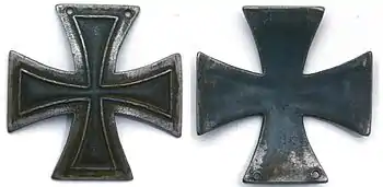 - Солдатские кресты прусского производства чеканились из тонкой жести и покрывались чёрной краской за исключением краёв на лицевой стороне. Края закрашивались серебристой краской. На плече креста было два отверстия для пришивания к мундиру. Размер — 43×43 мм. В России солдаты, ввиду того, что жестяные кресты были непрочными и быстро приходили в негодность, изготавливали для ношения кресты из свинцово-оловянного сплава по контуру, идентичному прусскому, но различной формы и методов крепежа. Размеры варьируются от 25 мм до 45 мм.