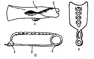 ![]() Предметы быта: а — топор с «крыльями» (1 — крылья, 2 — выемка); б — смычковидная фибула (1 — иглодержатель, 2 — игла, 3 — пружина); в — обоюдоострая бритва | ||||