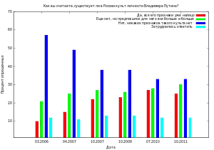 Общероссийские социологические опросы по теме «существует ли культ личности Путина?» проводились как минимум с 2004 года[29]. По данным Левада-Центра за март 2006 года 57 % россиян не видело наличие культа личности Владимира Путина, тогда как однозначно отмечало наличие культа личности на тот момент времени лишь 10 % опрошенных[30]. К октябрю 2011 года первый показатель снизился до 33 %. В то же время, по состоянию на октябрь того же года, доля россиян, согласных с наличием культа личности Путина, выросла до 25 %. Доля же россиян, видящих предпосылки к возникновению культа личности, выросла с 21 % в марте 2006 года до 30 % в октябре 2011 года[31].