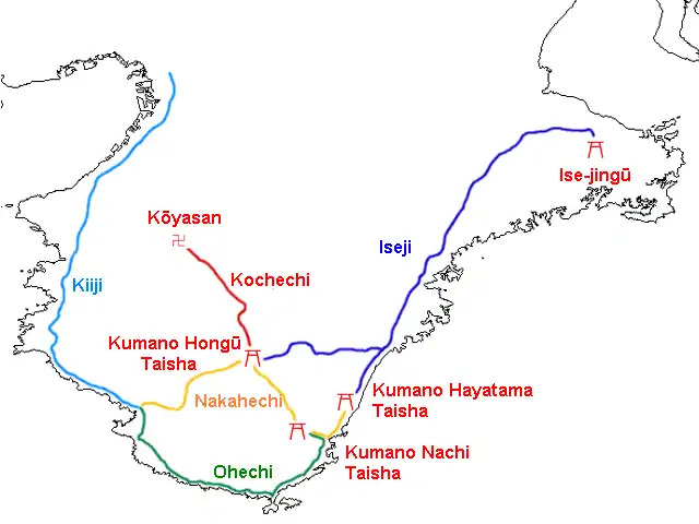 - Большая тропа, яп. 大辺路, Оохэти: Танабе — Кусимото (串本) — Три Священных Горы Кумано, 120 км вдоль побережья океана