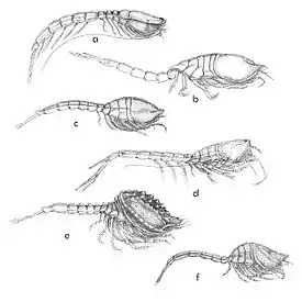 Число вошедших в состав головогруди торакальных сегментов (а соответственно — пар ногочелюстей) обычно составляет от 3—4, реже доходит до 6[7]. Остальные сегменты торакса (в зависимости от удлинения головогруди — 4—5, реже 2—3) составляют переон, конечности которого (переоподы) служат для плавания и зарывания в грунт[7]. У взрослых самок несколько первых переоподов несут оостегиты, формирующие выводковую сумку[7].