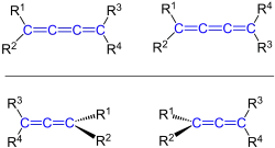 Результатом этого является цис-транс-изомерия кумуленов с нечётным числом кумулированных связей и аксиальная хиральность (точечная группа D2d) асимметрично замещённых алленов и кумуленов с чётным числом, образующих энантиомеры.